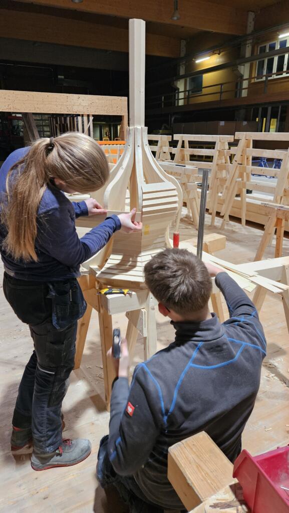 Ab Mitte der Woche widmeten sich 2 Teams mit je 4 Lehrlingen dem herausfordernden Projekt einen Zwiebelturm maßstäblich anzufertigen. Die knifflige Basiskonstruktion wurde gemeinsam erarbeitet: mit Zimmermannsbleistift, Zirkel und Winkelmesser gingen die Jungen an die Arbeit. Präzision ist gefragt beim Aufreißen, Ausarbeiten und dem anschließenden millimetergenauen Zuschnitt, damit die Teile auch wirklich gut ineinanderpassen. Für die Kuppel selbst fertigten die Lehrlinge Schablonen an. Zuletzt wurden die Zwiebeltürme sogar mit Schindeln eingedeckt.